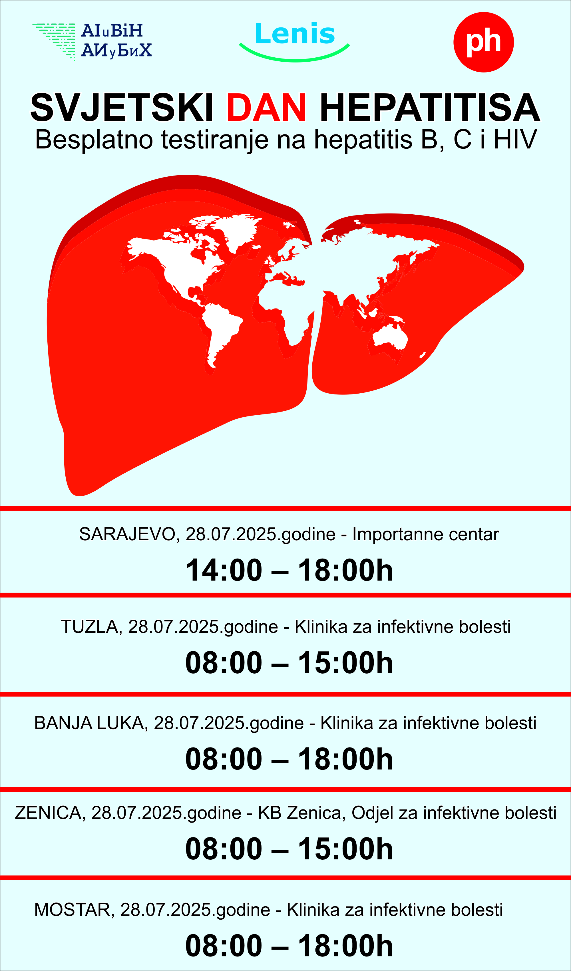 besplatno testiranje na hepatitis i HIV u Sarajevu, Tuzli, Banja Luci, Zenici i Mostaru dana 28.07.2025. godine. U Sarajevu će testiranje biti organizovano od 12-18h u Importanne centru, dok će se u ostalim gradovima vršiti unutar Klinika za infektivne bolesti tokom istog dana.