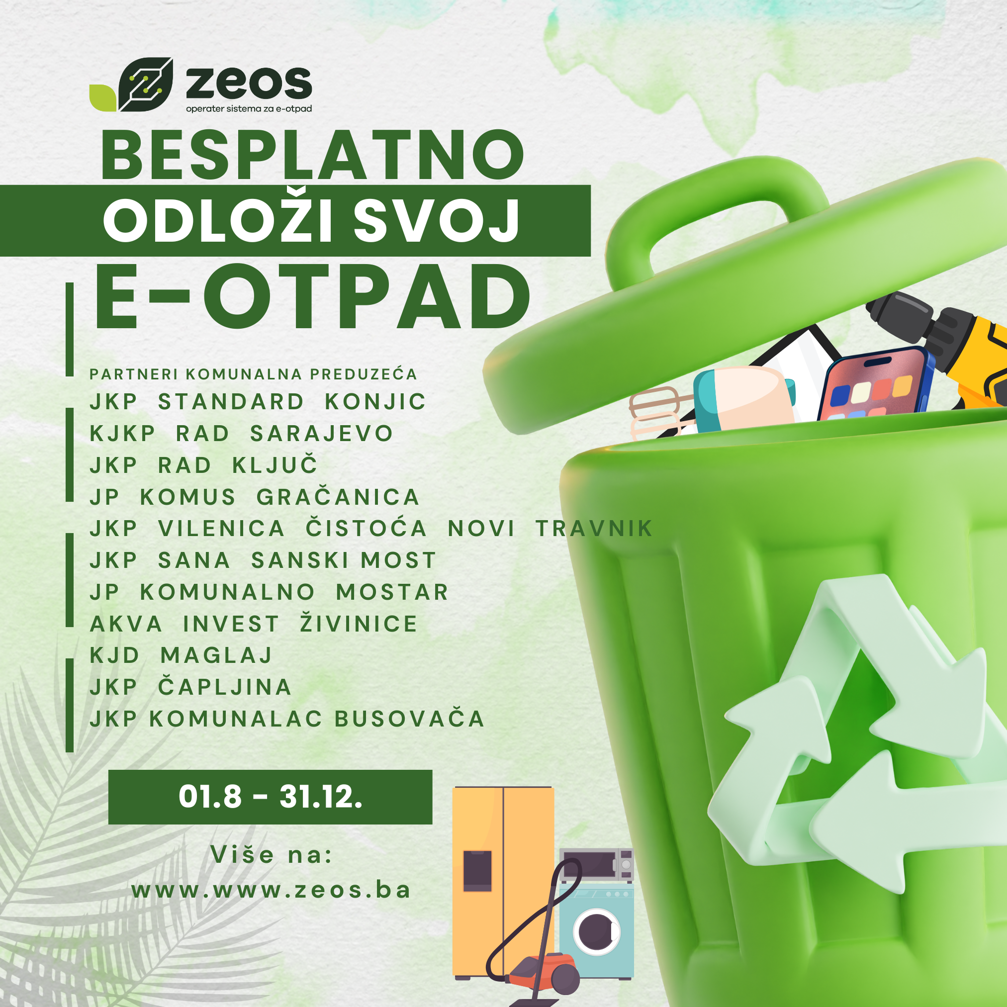 U vremenu kada se suočavamo s ogromnim količinama elektronskog otpada koji prijeti našem zdravlju i prirodi, ZEOS eko-sistem d.o.o., ovlašteni operater sistema za upravljanje e-otpadom u Bosni i Hercegovini, zajedno s 11 komunalnih preduzeća širom Federacije BiH, radi zajedno na unapređenju stanja okoline, te pokreće posebnu akciju prikupljanja e-otpada. Lista komunalnih preduzeća je u tabeli ispod.