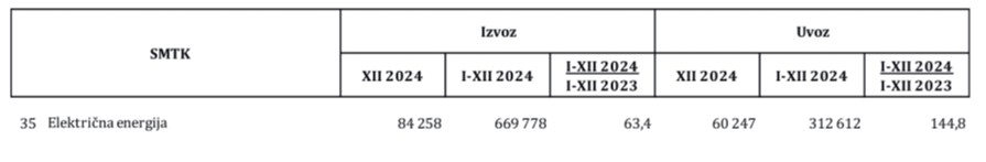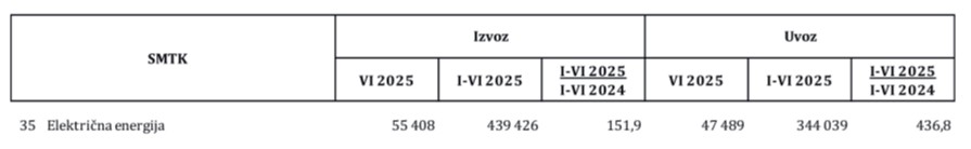 Lani je iz BiH izvezeno električne energije u vrijednosti od 669,78 miliona KM, što je u konačnici dalo vanjskotrgovinski suficit od 357,17 miliona KM, a slična situacija bila je i u prvih šest mjeseci 2025.