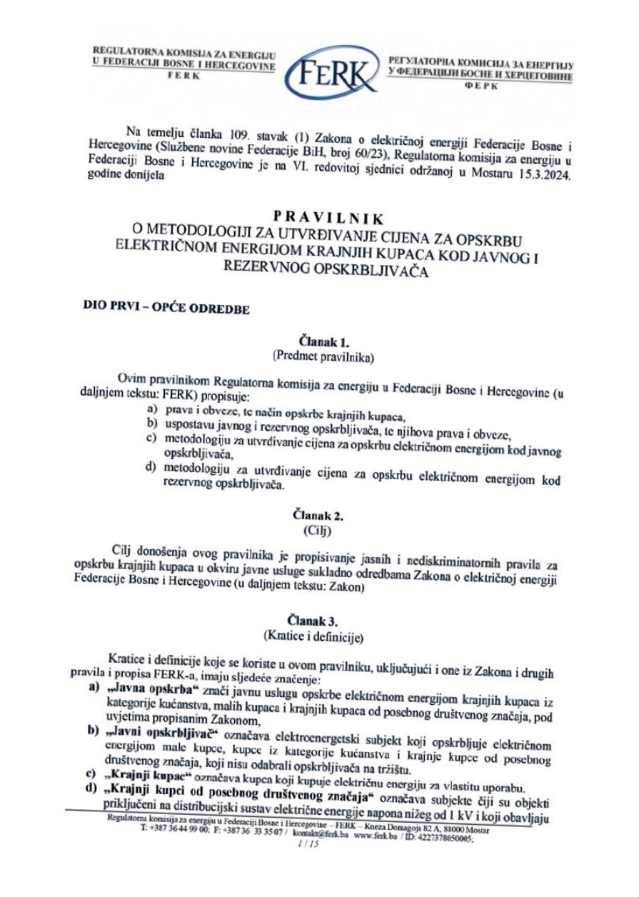 “Pravilnikom se propisuju prava i obveze te način opskrbe krajnjih kupaca, uspostava javnog i rezervnog opskrbljivača te njihova prava i obveze, kao i metodologija za utvrđivanje cijena za opskrbu električnom energijom kod javnog i rezervnog opskrbljivača.