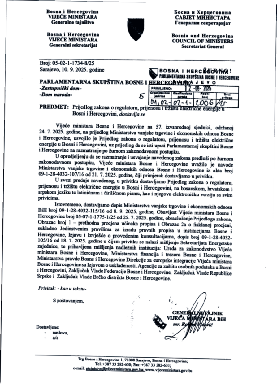 Nacrt Zakona o regulatoru, prijenosu i tržištu električne energije, koji je trenutno u parlamentarnoj proceduri, ima za cilj transponiranje ključnih elemenata Paketa i omogućavanje uspostavljanja pravnog okvira za spajanje tržišta s jedinstvenim evropskim tržištem električne energije.
