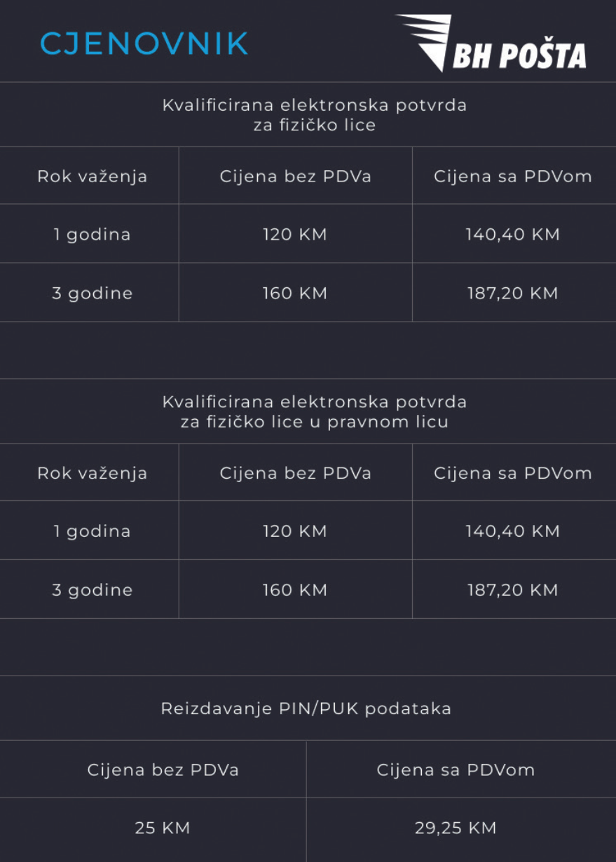 Prema aktuelnom cjenovniku BH Pošte, kvalificirana elektronska potvrda s jednogodišnjim važenjem košta 140,40 konvertibilnih maraka, a sa trogodišnjim 187,20 KM. Cijena reizdavanja PIN/PUK podataka je 29,25 KM.