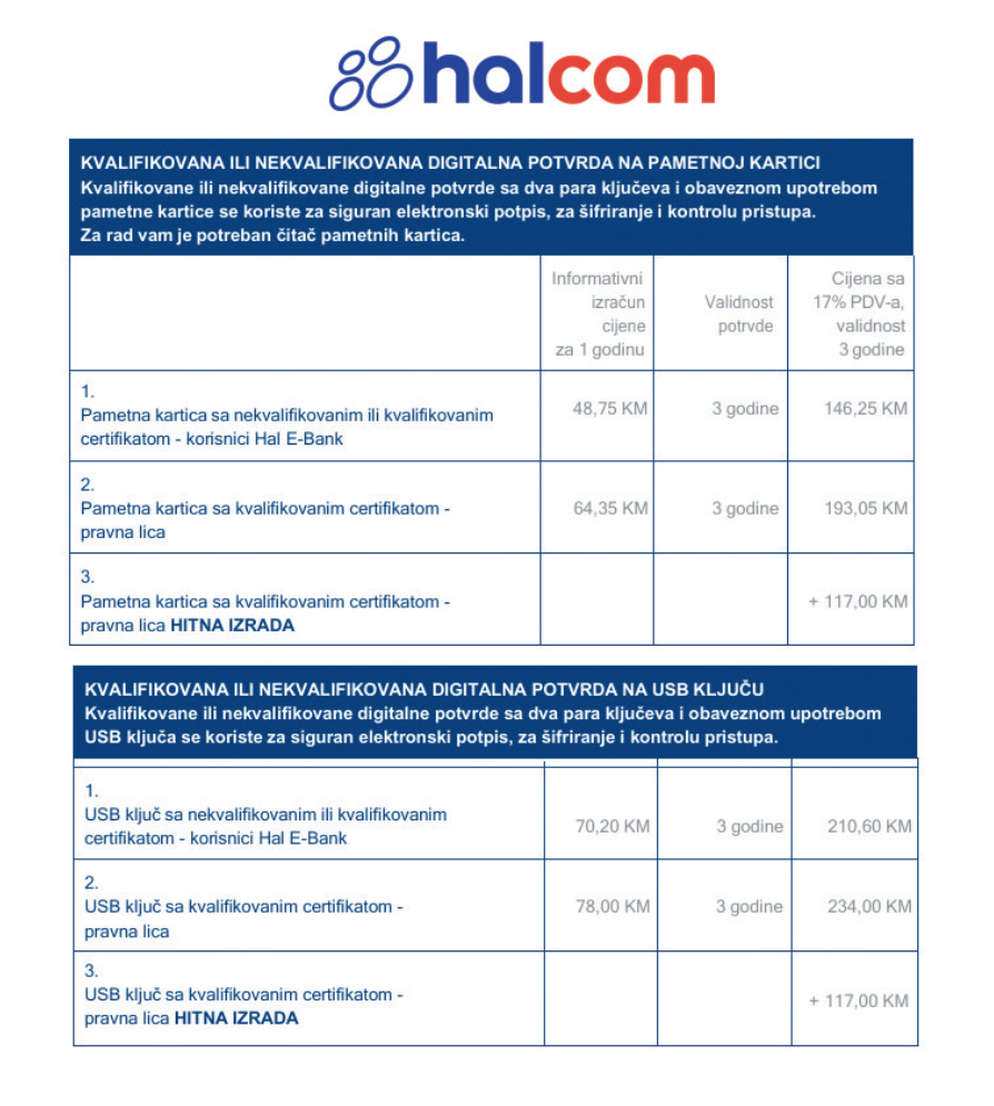 S jednakim rokom važenja, USB ključ sa nekvalificiranim ili kvalificiranim certifikatom za korisnike Hal E-Bank košta 210,60 KM, a USB ključ sa kvalificiranim certifikatom za pravna lica 234 KM (uz eventualnu doplatu 117 KM za hitnu izradu).