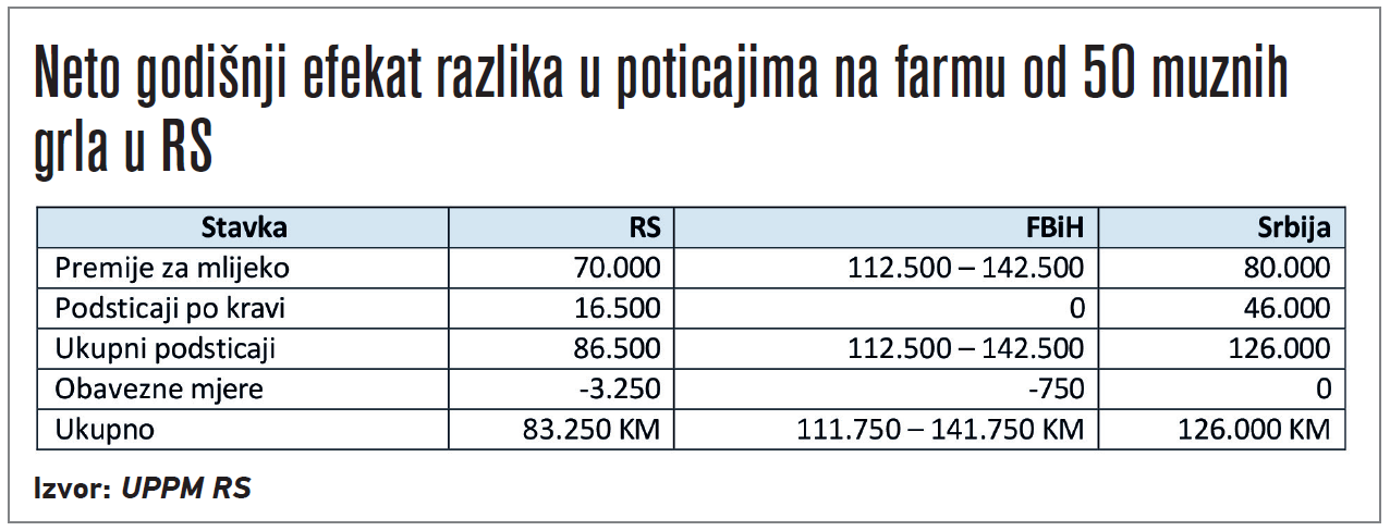 “Za farmu sa 50 muznih krava, ukupne godišnje premije za mlijeko u RS iznose 70.000 KM, u FBiH između 112.500 i 142.500 KM, a u Srbiji 80.000 KM.