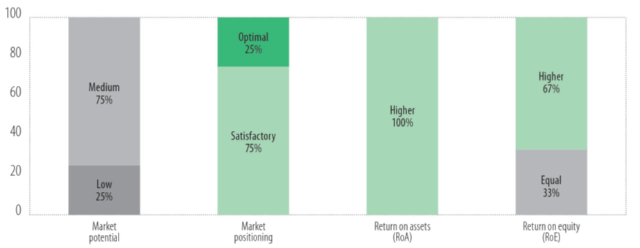 Prema kriteriju povrata na imovinu (prilagođenog trošku rizika) u poređenju sa ukupnim poslovanjem matične bankarske grupacije, BiH je neprikosnoveni regionalni šampion, jer je visokoprofitabilno tržište za sve anketirane banke, u čemu joj tek djelimično pariraju Bugarska i Rumunija, dok je Slovačka najlošija u regiji, sa profitabilnošću jednakom ili slabijom od ostvarene na grupacijskom niovu.