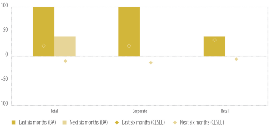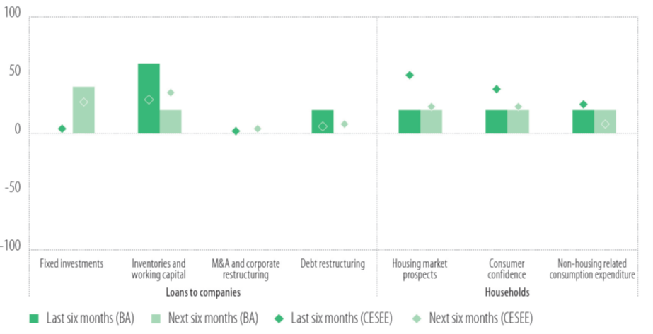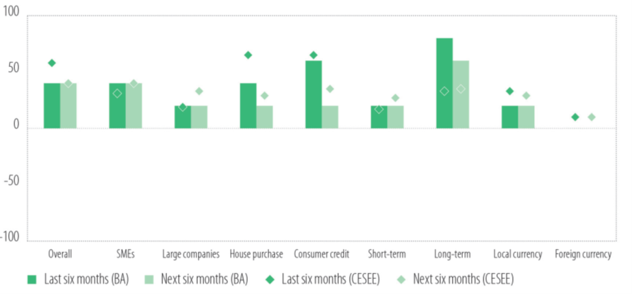 Gledajući unaprijed, očekuje se da će potražnja za kreditima ostati povoljna u narednih šest mjeseci, uglavnom vođena kompanijama, dok će potražnja domaćinstava za potrošačkim kreditima i hipotekama vjerovatno oslabiti.