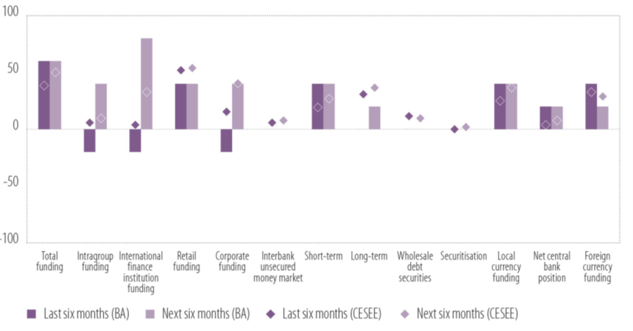 Nasuprot tome, finansiranje od centralnih banaka je ponovo opalo“, konstatira se u Anketi, uz napomenu da bankari očekuju da će pozitivno okruženje finansiranja nastaviti, pa čak i ojačati u narednih šest mjeseci, pri čemu “depoziti stanovništva i preduzeća ostat će primarni izvor, dopunjen zaduživanjem na veleprodajnom tržištu i sredstvima međunarodnih finansijskih institucija“.