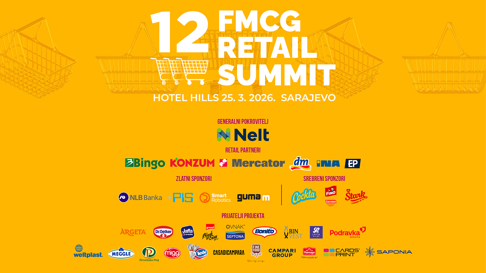 Dvanaesto izdanje FMCG Retail Summita, vodeće regionalne konferencije posvećene FMCG sektoru, bit će održano 25. marta 2026. godine u Hotelu Hills u Sarajevu. Događaj se organizira uz generalno pokroviteljstvo kompanije Nelt, a i ove godine okupit će vodeće predstavnike trgovačkih lanaca, proizvođača, distributera, logističkih kompanija i pratećih industrija iz Bosne i Hercegovine i regije.